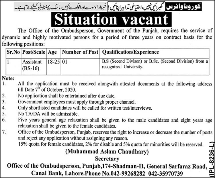 Situation Vacant in Office of the Ombudsperson (Govt of Punjab)
